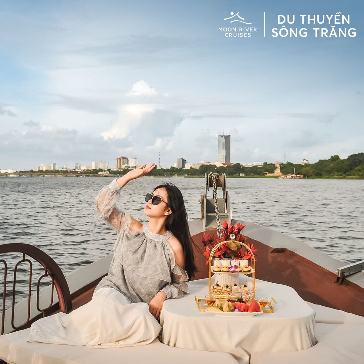 Thưởng trà chiều trên dòng Hương không chỉ là một dịp tuyệt vời để khách thương cùng gia đình, bạn bè thưởng lãm vẻ đẹp tinh tế của một bàn tiệc “ẩn chứa” nét xa hoa kiểu Anh do Du thuyền Sông Trăng công phu chuẩn bị với: bộ trà cụ tuyệt đẹp để pha trà thảo mộc (chế tác theo công thức riêng của thương hiệu); các loại bánh ngọt như gato flan hay sữa chua; bánh mặn với tart và sandwich; kèm trái cây tươi theo mùa.