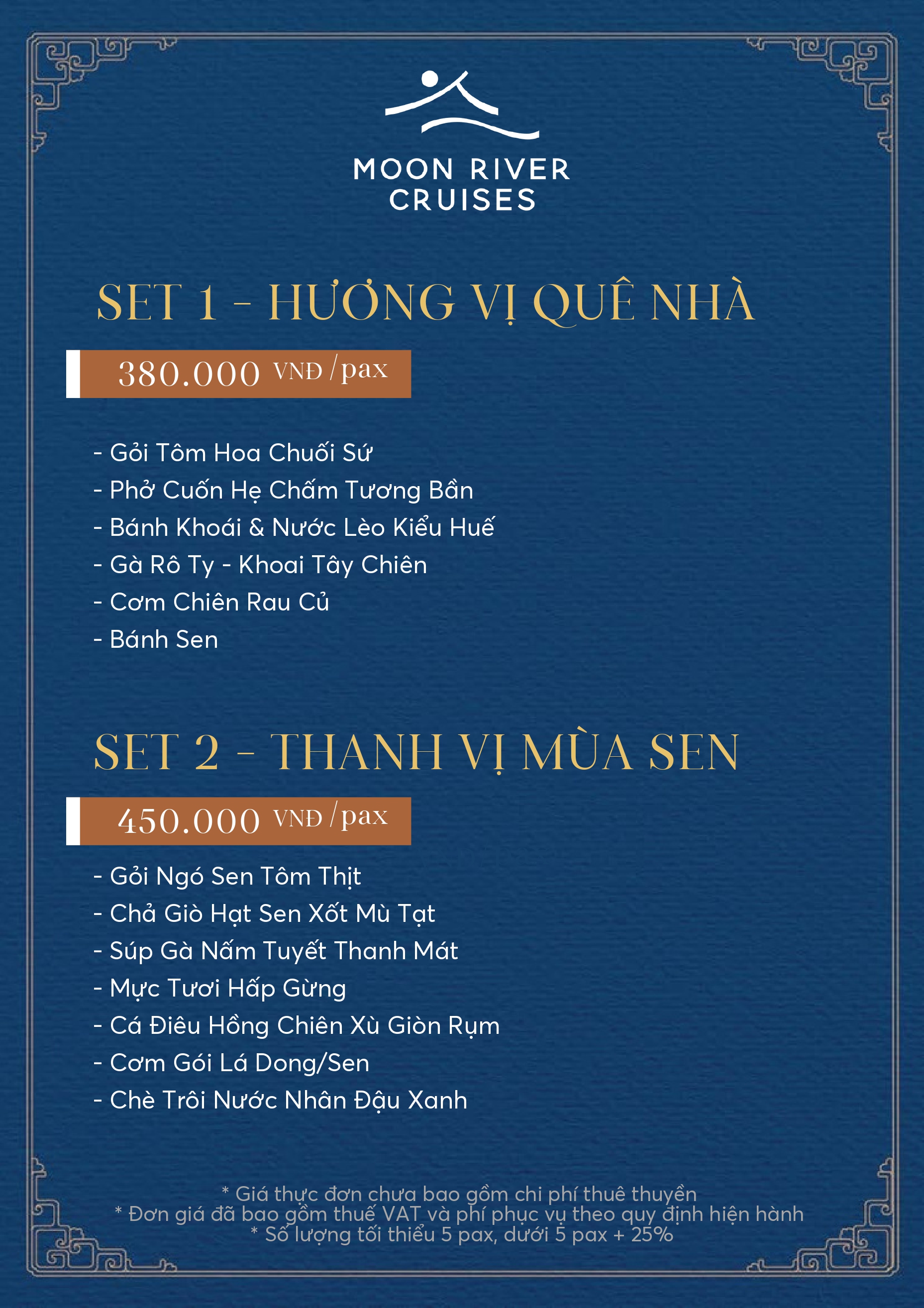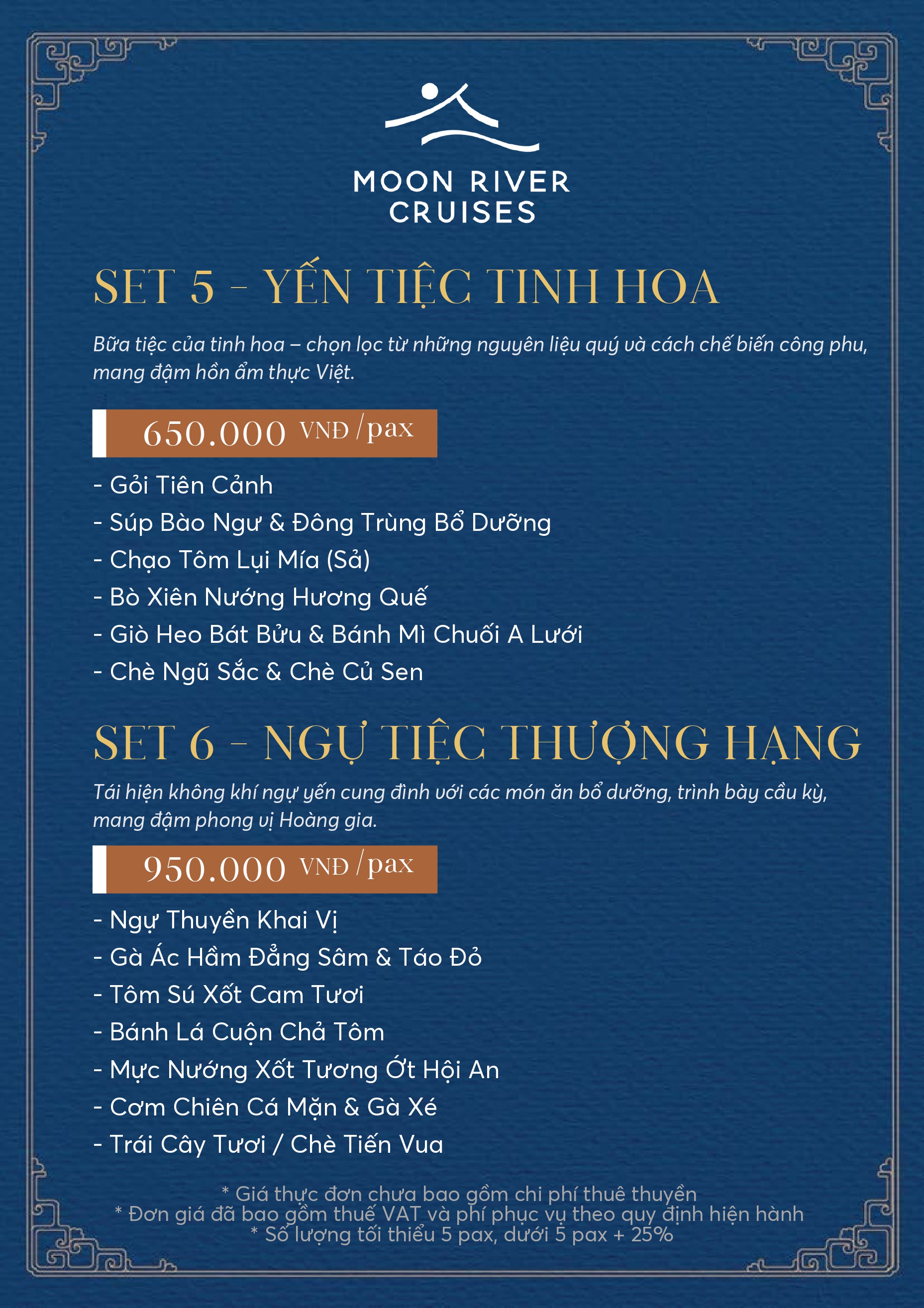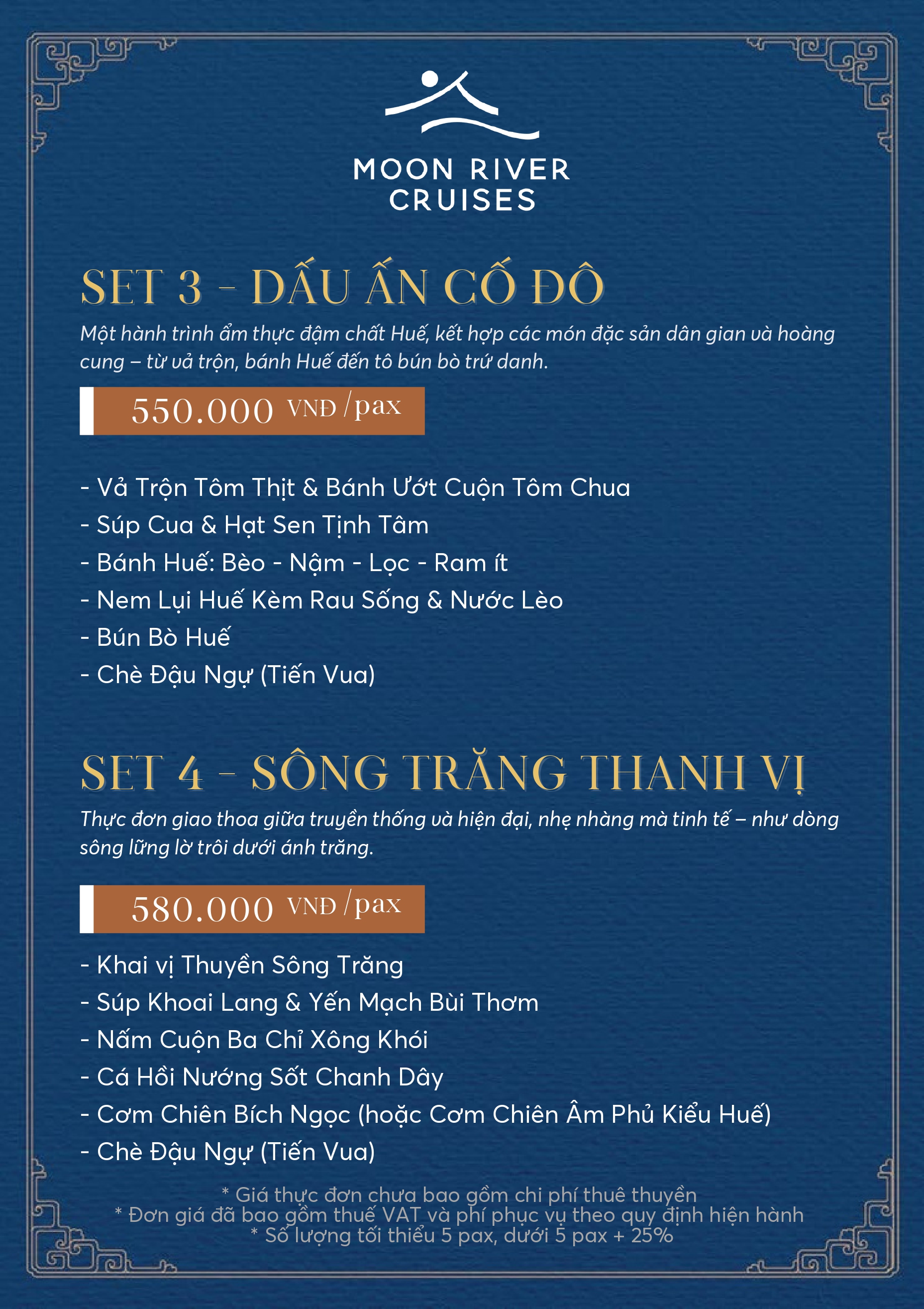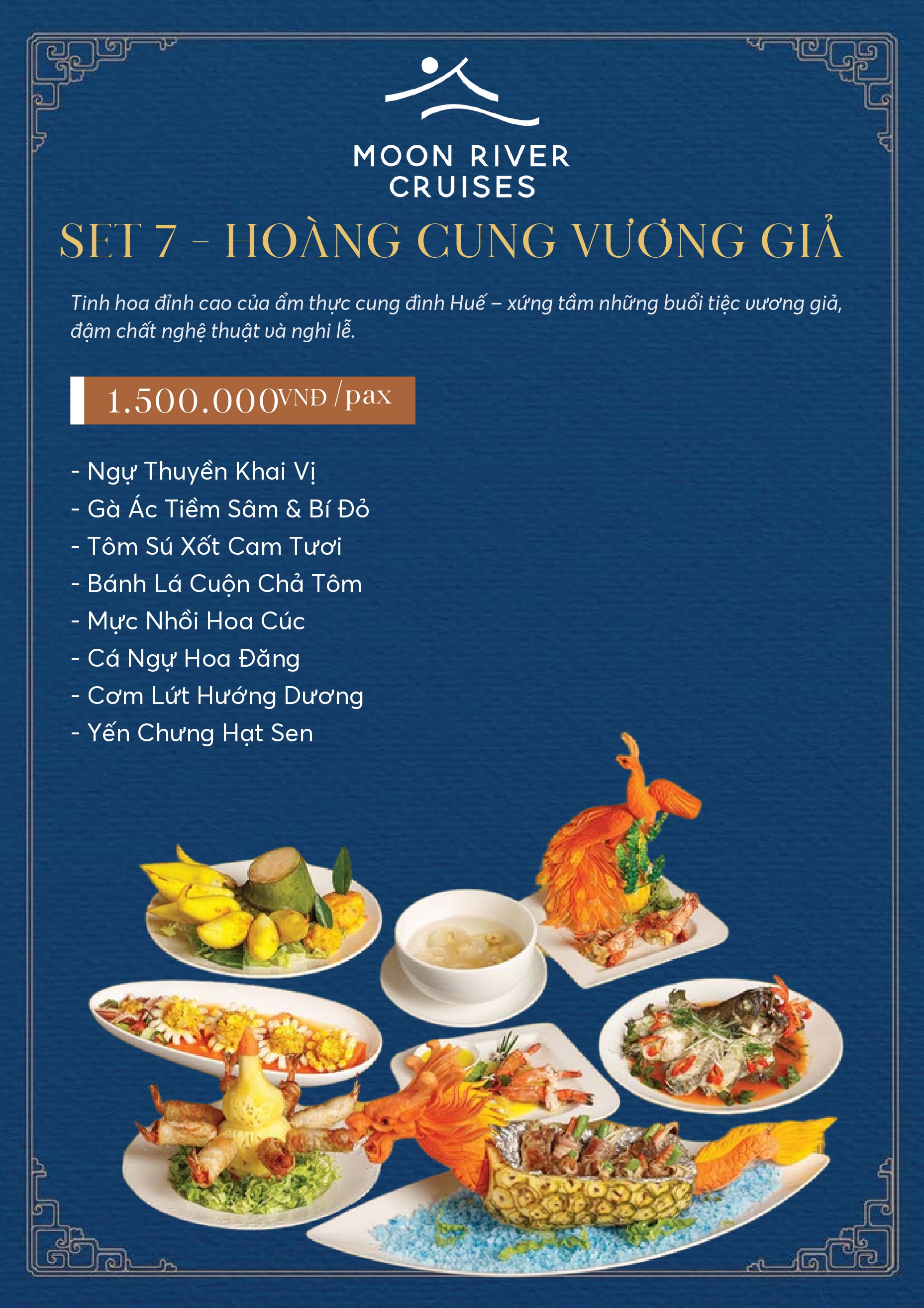 Trải nghiệm ẩm thực tinh tế nơi hương vị dân gian truyền thống và cung đình xứ Huế hoà quyện cùng nét sáng tạo đương đại trong không gian du thuyền giữa dòng Hương yên ả của xứ Huế.